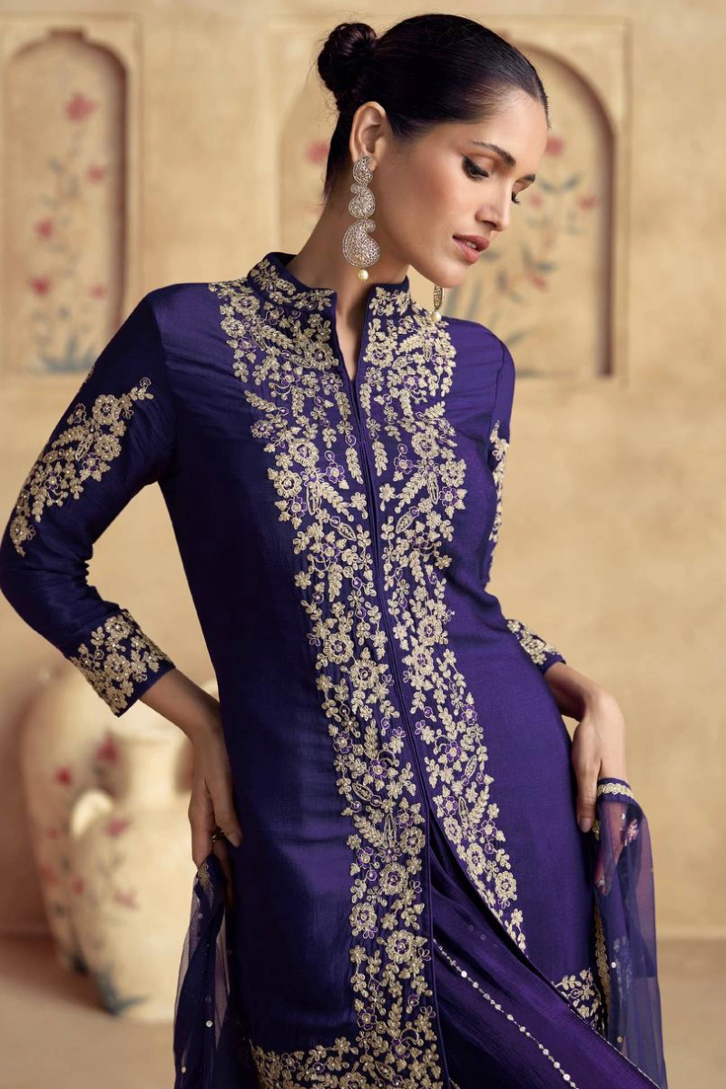 This sophisticated purple palazzo suit is crafted in premium chinon fabric and adorned with elegant embroidery for a refined ethnic look. The 35-inch embroidered top pairs effortlessly with a flowing palazzo, while the matching dupatta adds a touch of festive charm. Ideal for parties, festivities, and special occasions.