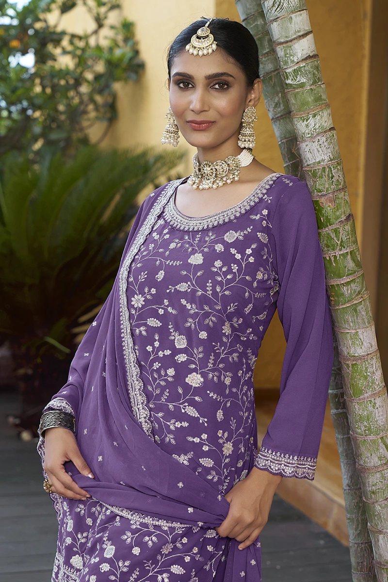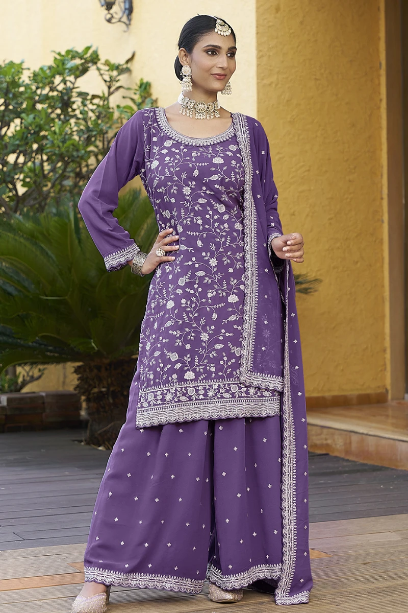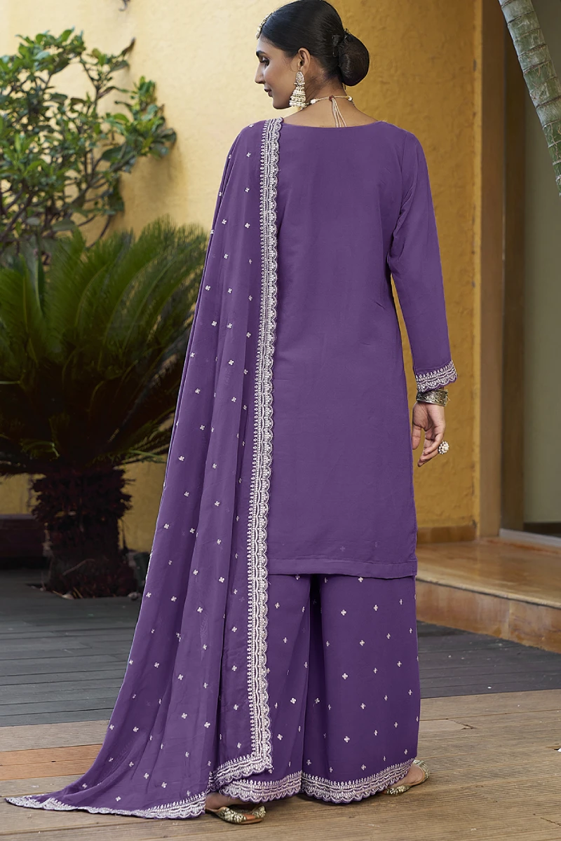 This Purple Georgette Palazzo Suit is designed for effortless sophistication. Featuring rich embroidery, resham work, and sequins on flowy georgette fabric, the outfit offers both style and comfort. Completed with a soft santoon lining and matching georgette dupatta, it’s ideal for festive occasions, cultural events, and evening parties.