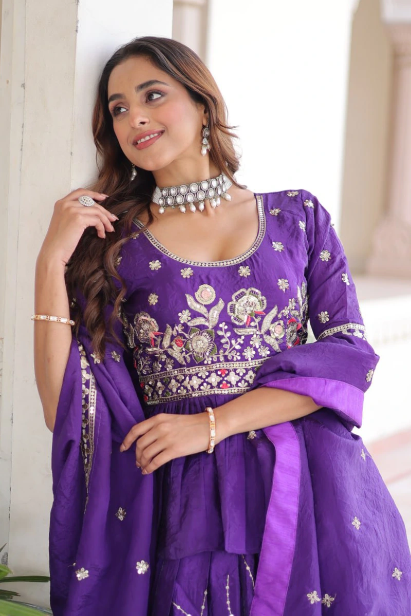 A stylish gold crush fabric short kurti paired with a beautifully embroidered skirt and matching dupatta. The rich purple tone adds a festive charm, making it perfect for weddings, parties, and special occasions.