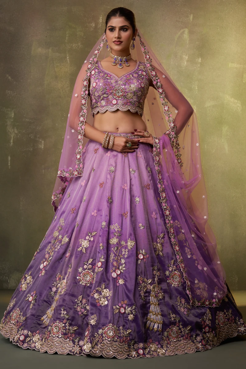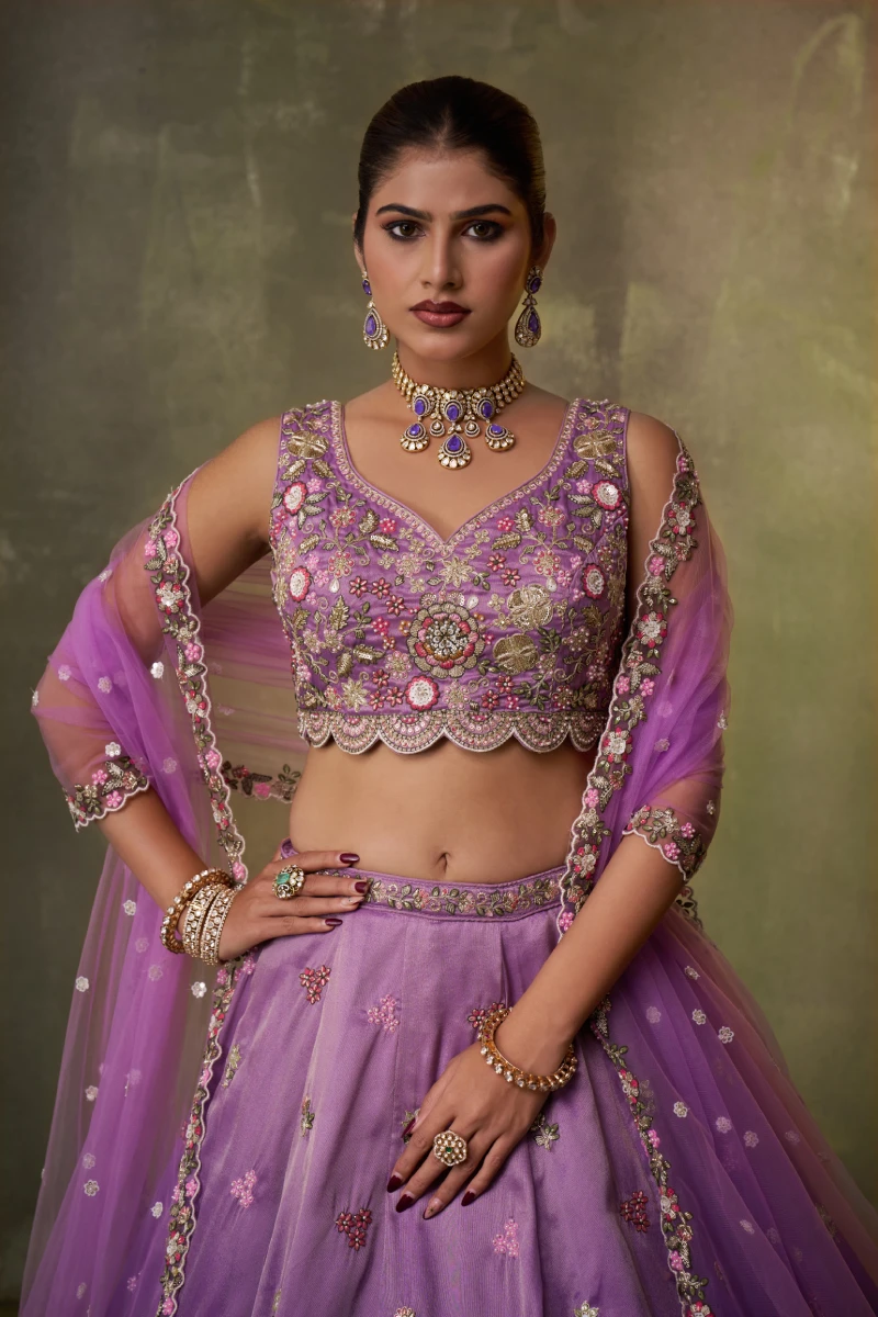 This royal purple lehenga set is crafted from premium tissue fabric highlighted with exquisite moti, sequins, coding, and thread embroidery work. The lehenga is enhanced with a detailed embroidered hem, layered can-can structure, and handcrafted ethnic latkan tassels. The coordinated tissue blouse comes with a sweetheart neckline, heavy embroidery, and an attached shantoon inner. Completing the look is a purple net dupatta finished with heavy coding and embroidery cut-work borders, perfect for grand celebrations.