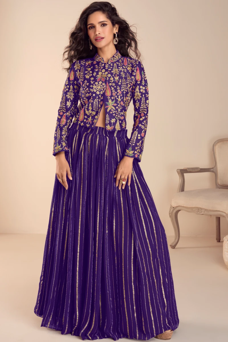This elegant Purple lehenga set is crafted with a fashionable jacket-style top in premium Vichitra Silk featuring intricate embroidery and hand work detailing. The short 18–19 inch top enhances the modern appeal while the Pure Viscose Silk skirt provides a luxurious and flowy finish. Accompanied by a matching Vichitra Silk dupatta, this outfit is ideal for festive occasions and celebration wear, combining sophistication with contemporary ethnic fashion.