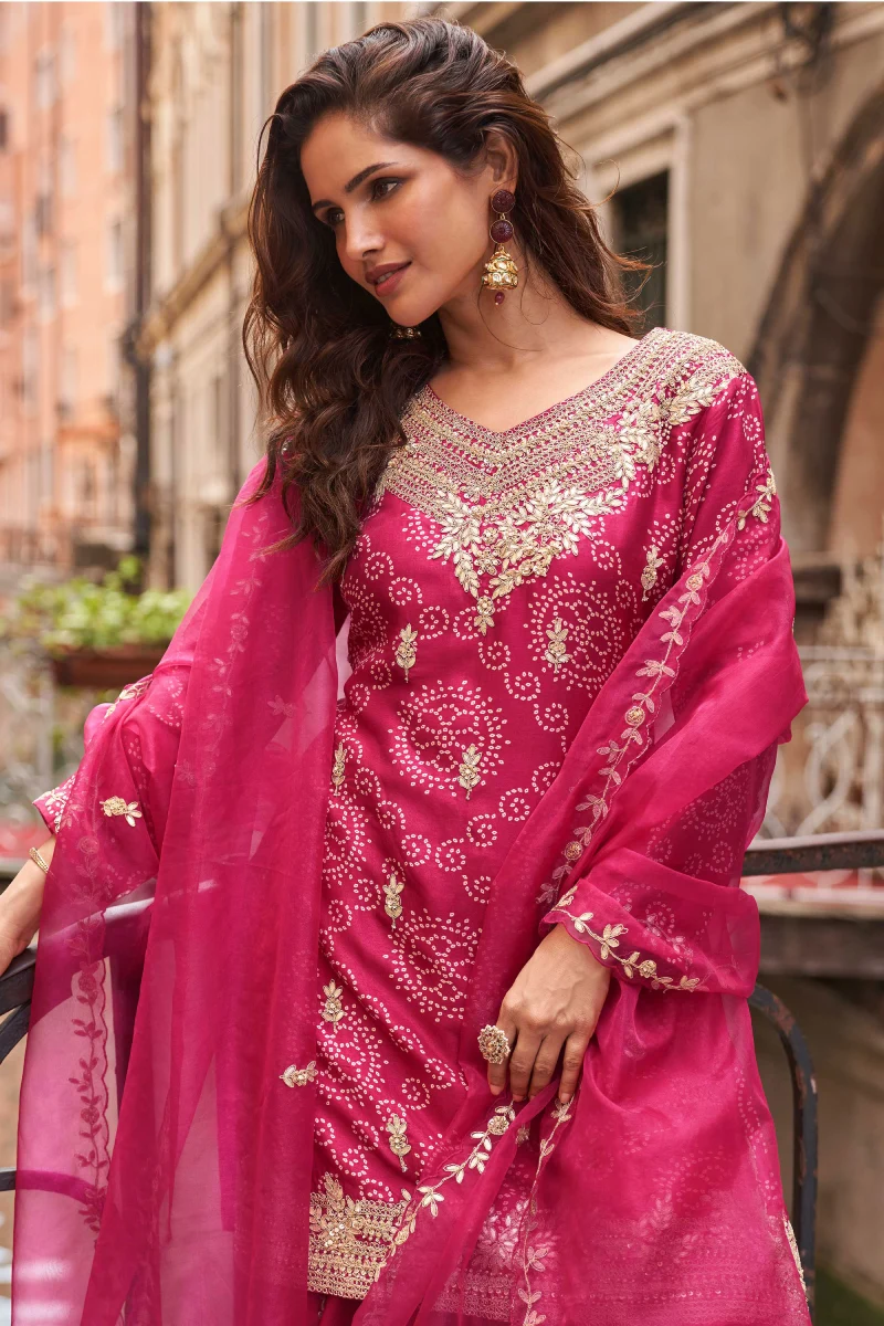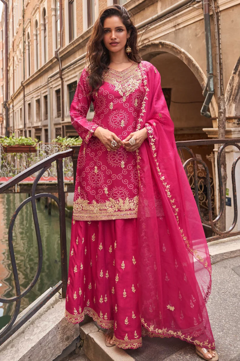 This stunning rani pink palazzo set showcases premium chinon silk fabric across the top, sleeves, bottom, and dupatta, supported by a soft shantoon lining. The straight-cut top, measuring 32 inches in length, is adorned with intricate zari embroidery, sequins, gota work, and digital prints for a vibrant festive look. Perfectly coordinated with a matching palazzo and dupatta, this ensemble is an excellent choice for weddings, festivities, and celebratory events.
