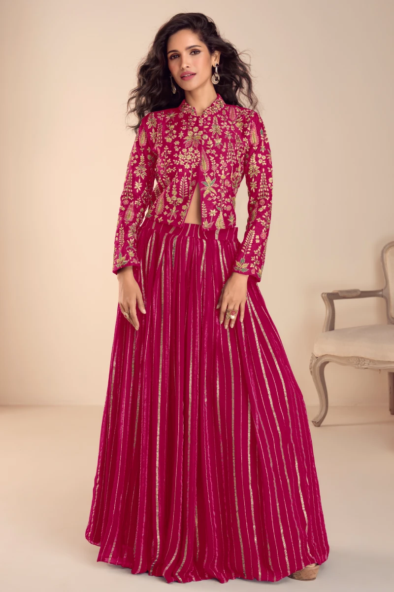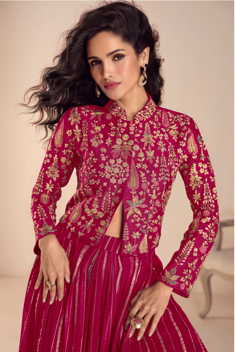 This stunning Rani Pink lehenga set features a stylish jacket-style top crafted from premium Vichitra Silk, beautifully detailed with intricate embroidery and elegant hand work. The short jacket top with a length of 18–19 inches adds a modern ethnic touch, perfectly paired with a flowy Pure Viscose Silk skirt for a graceful silhouette. Completed with a matching Vichitra Silk dupatta, this outfit is ideal for festive celebrations, weddings, and special occasions, offering a perfect blend of contemporary style and traditional elegance.