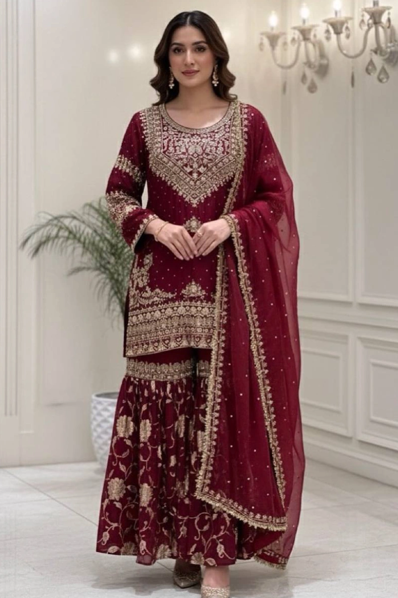 This elegant Red Sharara Suit is crafted from premium georgette fabric and highlighted with beautiful embroidery for a festive, graceful appeal. The 36-inch top offers a flattering silhouette, perfectly paired with a flowy sharara bottom for effortless movement. Ideal for weddings, festive occasions, and celebrations, this ensemble blends traditional charm with modern elegance.