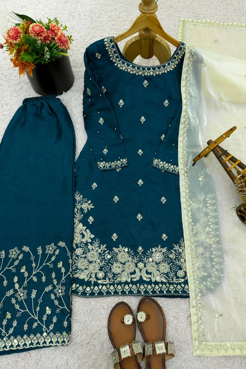 Designed in a refreshing teal blue shade, this Gmy silk palazzo suit features delicate embroidery that adds subtle glamour. The 38-inch top offers a flattering fit, while the palazzo and dupatta complete the ensemble, ideal for festive wear and evening gatherings.