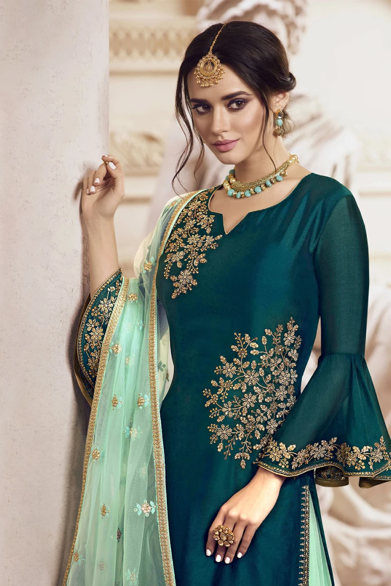 Make a statement with this Teal Palazzo Set paired with a Sky Blue dupatta, crafted in premium Rangoli Georgette. The beautifully embroidered top sparkles with sequins and stone work, offering a rich festive appeal. The palazzo bottom in soft Net adds a graceful flow, complemented by a matching Net dupatta. With Santoon lining, this outfit ensures comfort along with elegance.
