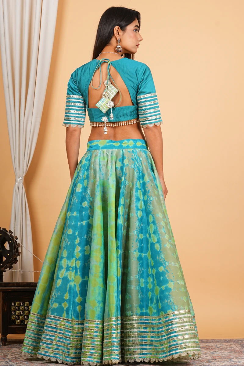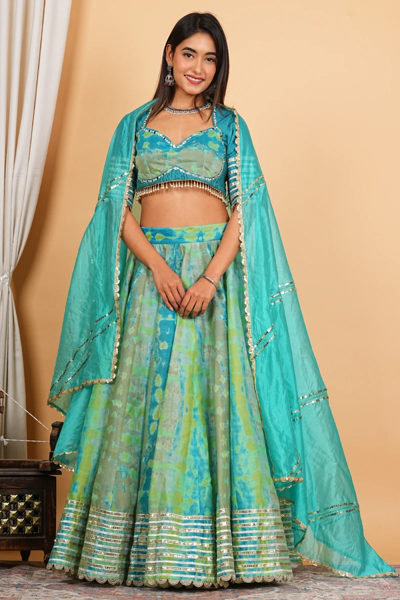 This elegant turquoise lehenga set is crafted in rich Chanderi fabric, featuring graceful digital prints enhanced with delicate embroidery and lace detailing. The lightweight yet festive appeal makes it a perfect choice for celebrations, day functions, and special occasions.