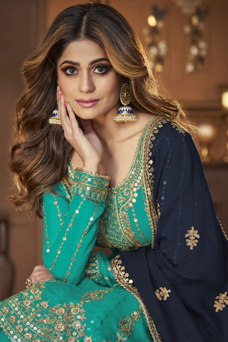Beautifully crafted in Georgette, this Turquoise Skirt Kameez features detailed embroidery enhanced with sequins and zari work. Paired with a flowing skirt and contrasted Blue Georgette dupatta, the outfit brings a stunning festive appeal. Santoon lining adds extra comfort, perfect for weddings and traditional events.