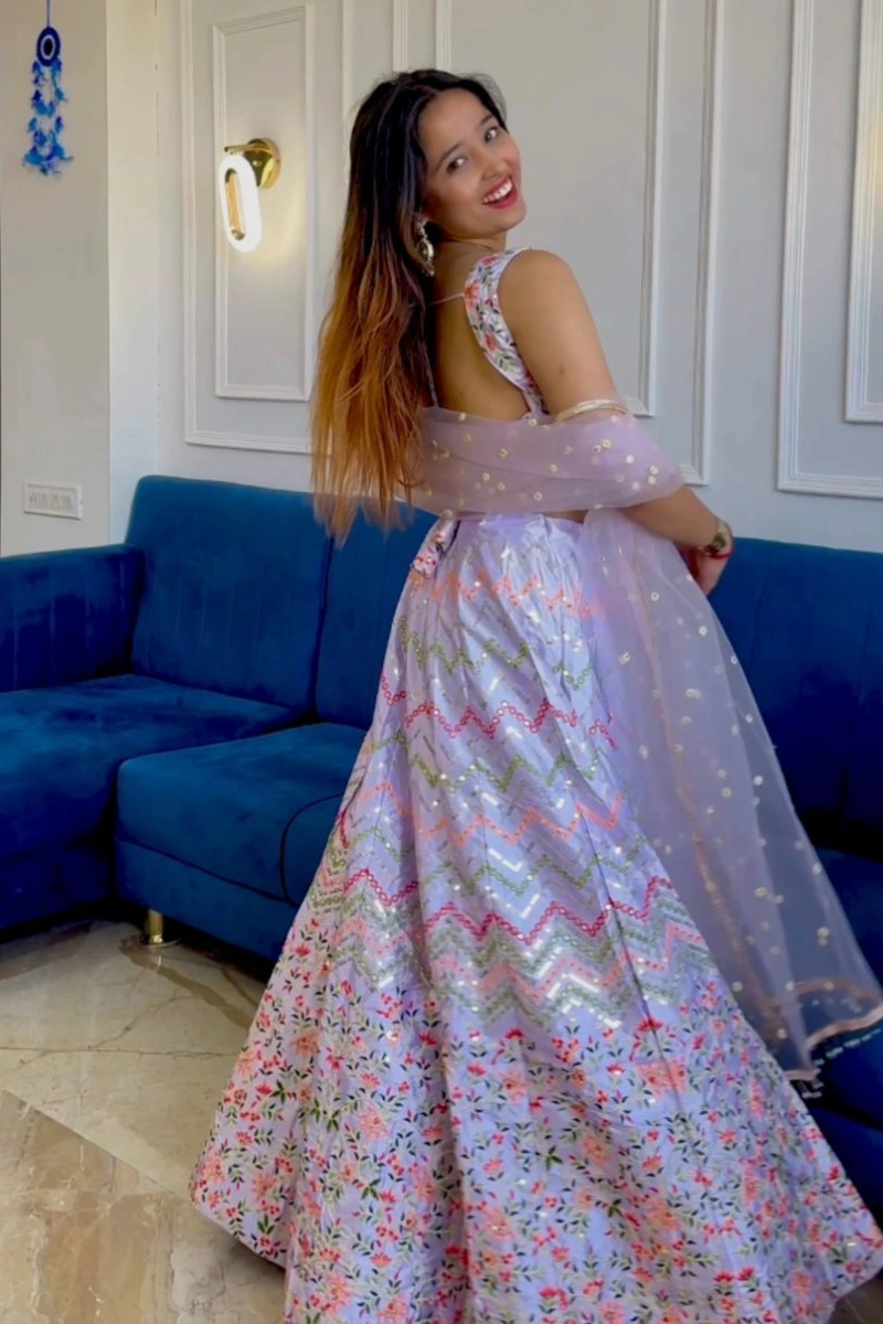 This elegant violet lehenga choli is crafted from rich satin silk, giving it a smooth, luxurious finish. The outfit is beautifully adorned with intricate thread work and shimmering sequins that add a festive sparkle. Paired with a lightweight net dupatta, it creates a graceful and stylish ensemble, perfect for weddings, parties, and special celebrations.