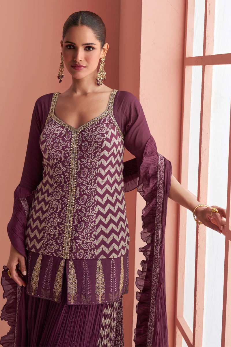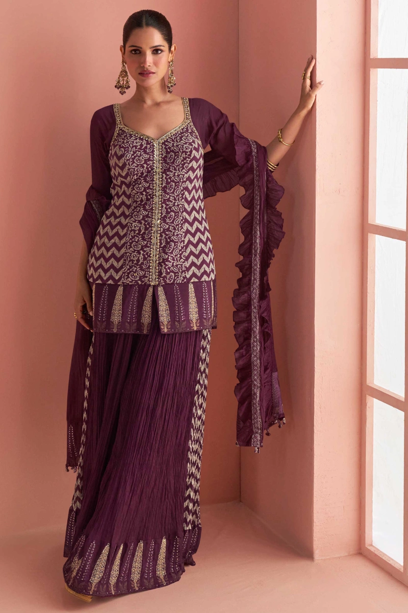 Rich and graceful, this wine-colored palazzo set features a beautifully crafted short top made from chinnon silk, complemented by a matching palazzo and dupatta. The outfit showcases detailed embroidery with mirror work and printed highlights, while the shantoon lining ensures comfort and structure. With a 35-inch short top length and an elegant silhouette, this set is perfect for evening functions, festive wear, and celebrations.