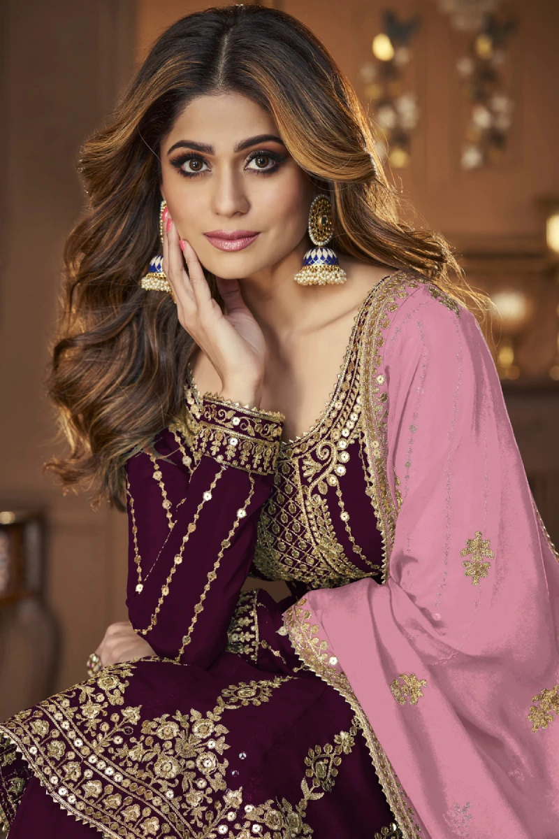 Wine Georgette Skirt Kameez with Pink Dupatta & Embroidered Sequins Work