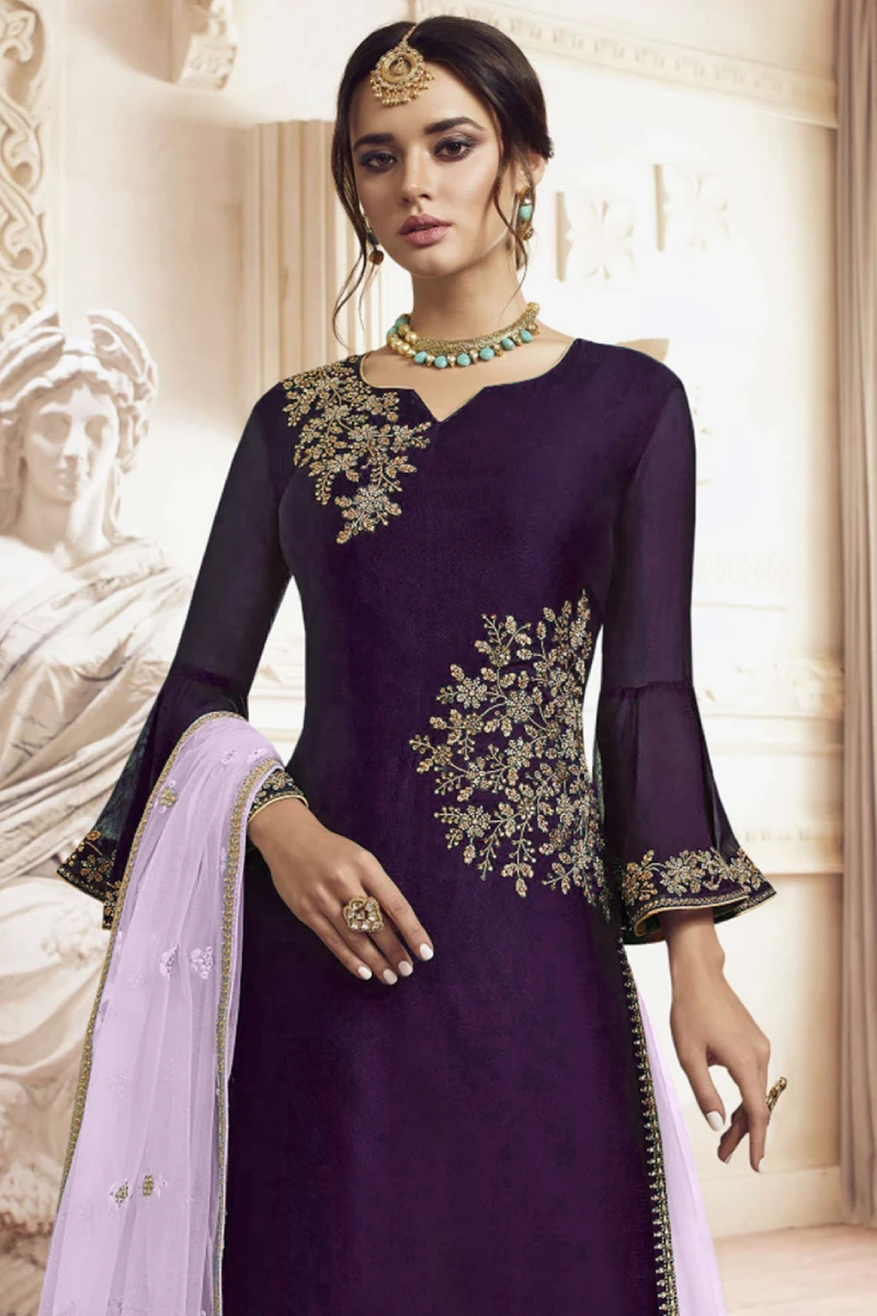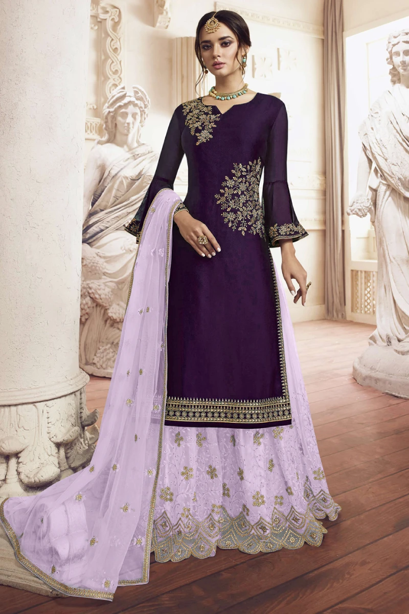 Graceful and sophisticated, this Wine Palazzo Set features rich embroidery, sequins, and stone work on the Rangoli Georgette top. The lightweight Net palazzo and dupatta in Light Purple create a beautiful contrasting look. Finished with Santoon lining for comfort, this outfit is ideal for receptions, sangeet, and festive occasions.