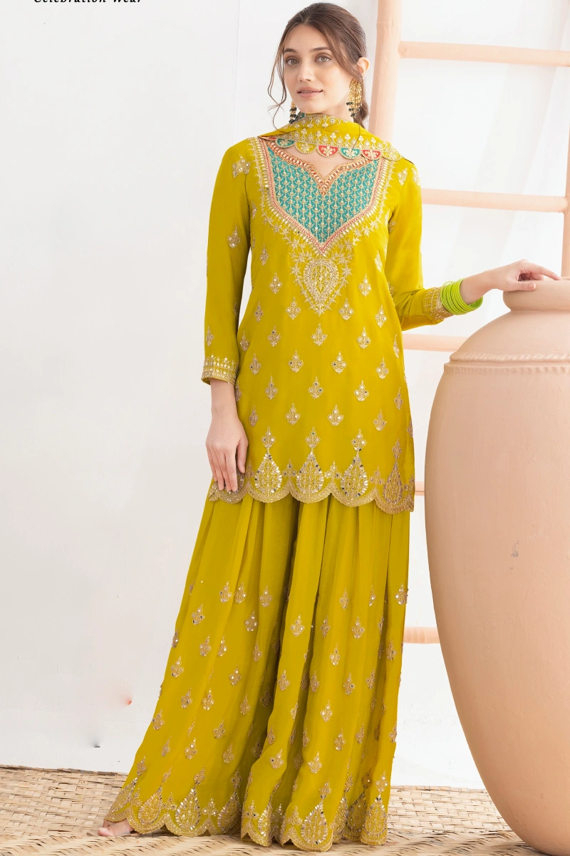 Bright and festive, this yellow chinon palazzo suit is designed with intricate dabka dori, sequin, and handmade mirror embroidery on premium-quality fabric. The finely embroidered top pairs effortlessly with a handworked chinon palazzo, offering both comfort and elegance. Completed with a premium chinon dupatta highlighted by four-side embroidered lace, this ensemble is ideal for celebrations and traditional events.