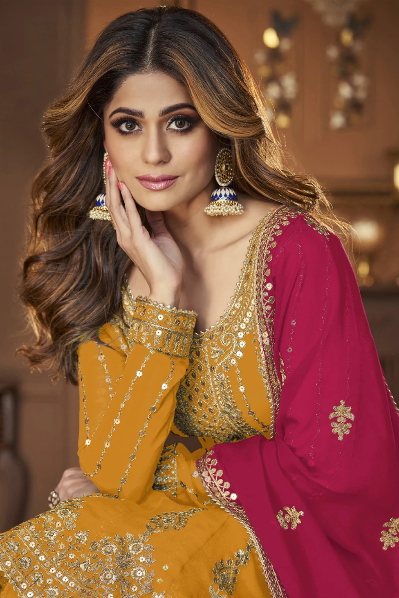 Bright and eye-catching, this Yellow Skirt Kameez stands out with intricate embroidery blended with sequins and zari accents. The coordinated skirt and contrasting Pink Georgette dupatta add a bold festive touch. Ideal for haldi, mehendi, and daytime celebrations.