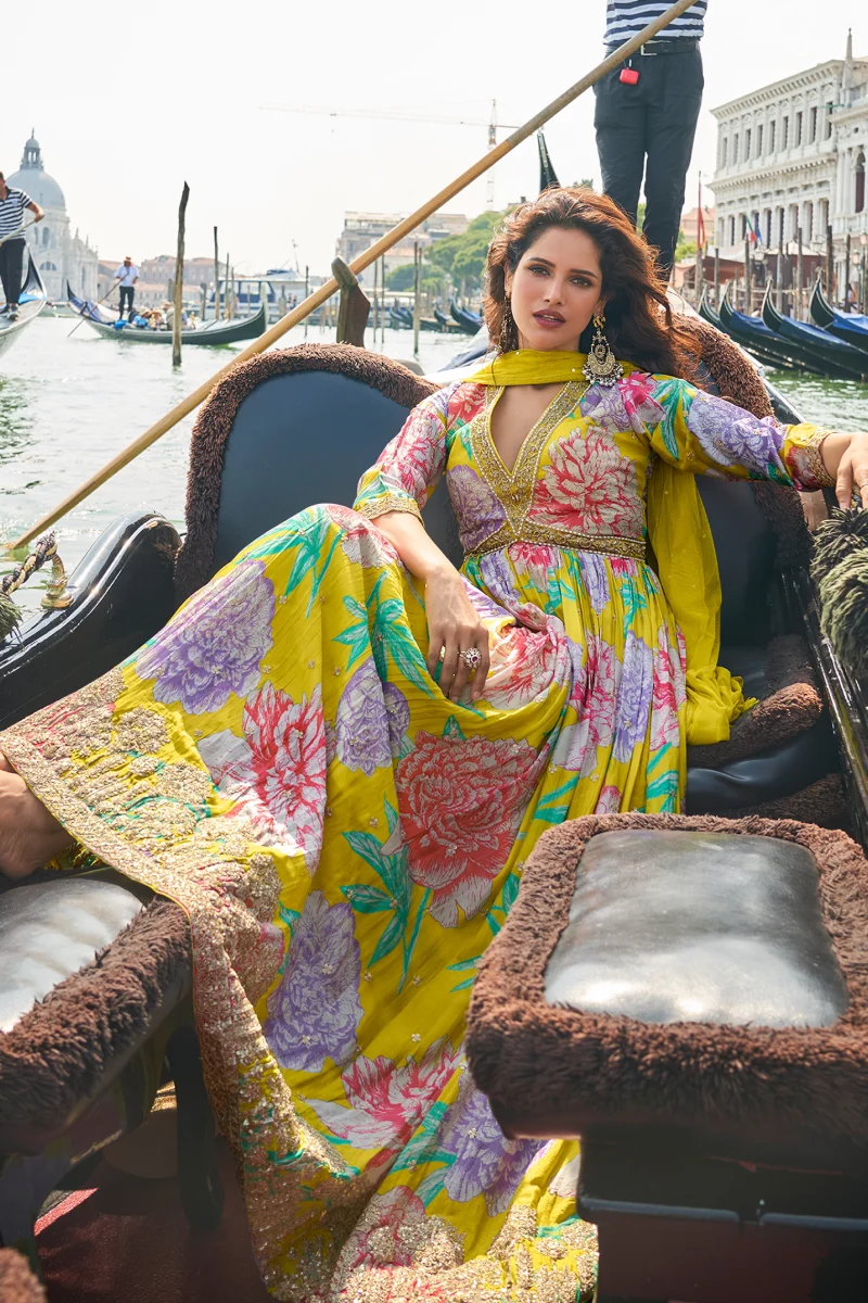 Bright and festive, this yellow Anarkali gown is made from heavy chinnon silk adorned with digital prints and rich embroidery sequence work on both sides. It is paired with a santoon silk inner for ease and comfort, along with a heavy net dupatta designed with minimal detailing for an elegant look. The gown length extends up to 54 inches, making it ideal for weddings and festive events.